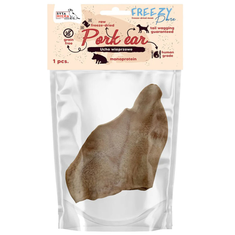 Syta Micha liofilizowane ucho wieprzowe to prosty, czysty skład oraz bezkompromisowa przyjemność, której psy nie potrafią się oprzeć.