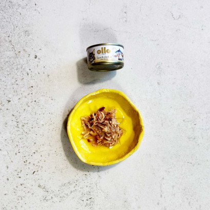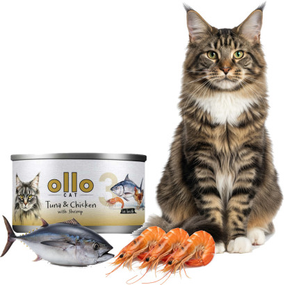 Produkt "OLLO CAT Nr3 Tuńczyk i Kurczak z Krewetkami w Sosie Własnym 70g" to karma dla kota o smaku tuńczyka, kurczaka i krewetek, dostępna w 70-gramowej puszce z naturalnym sosie własnym, charakteryzująca się krótkim, zbilansowanym składem oraz wysoką zawartością mięsa i ryb.