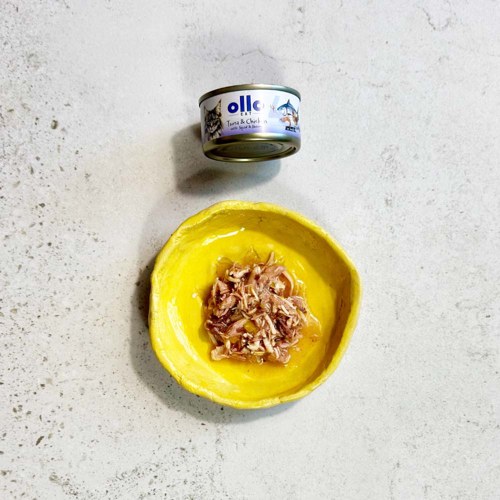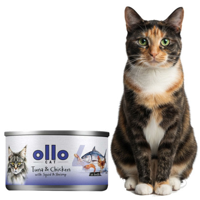 OLLO CAT Nr4 Tuńczyk i Kurczak z Kałamarnicą i Krewetkami w Sosie Własnym 70g to mokra karma dla kotów, która stanowi naturalną i lekkostrawną dietę opartą na wysokiej zawartości ryb i mięsa z kurczaka, z dodatkiem kałamarnicy i krewetek. Karma dostarcza cennych kwasów tłuszczowych Omega-3 (DHA i EPA) wspierających pracę serca, mózgu i układu nerwowego, a także witamin i minerałów ważnych dla zdrowia kota. Jest to produkt bez zbóż, glutenu, konserwantów i sztucznych barwników, rekomendowany dla kotów ceniących naturalne smaki.