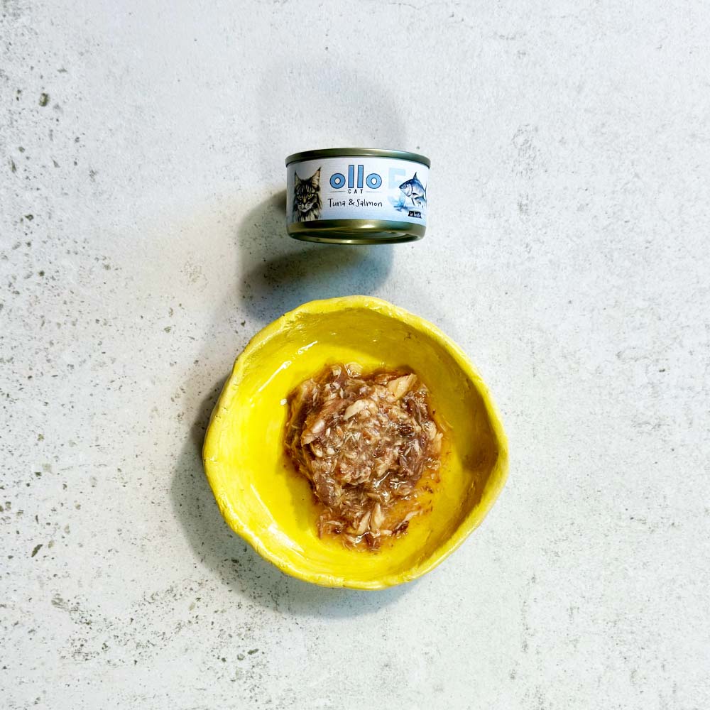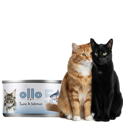 OLLO CAT Nr5 Tuńczyk i Łosoś w Sosie Własnym 70g" to karma dla kotów, która jest naturalną, kompletną karmą z wysokiej jakości, starannie dobranych filetów z tuńczyka i łososia. Karma ta jest gotowana na parze i przechowywana w galaretce warzywnej, dzięki czemu jest wolna od dodatków i konserwantów, bogata w szlachetne białko oraz cenne kwasy tłuszczowe omega-3, a jednocześnie uboga w węglowodany.
