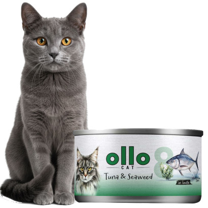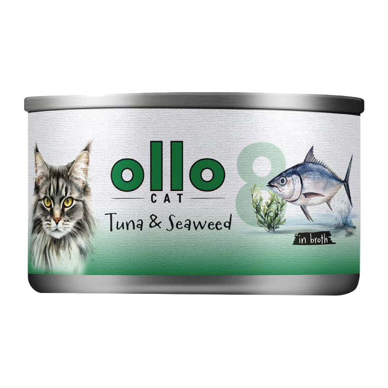 OLLO CAT Nr8 Tuńczyk i Wodorosty w Sosie Własnym 70g to produkt spożywczy dla kotów, który jest karmą uzupełniającą. Posiada skład mięsny bogaty w białko, kwasy tłuszczowe omega-3, witaminy i minerały, z dodatkiem wodorostów. Produkt ten jest niskokaloryczny i lekkostrawny, bez sztucznych dodatków.