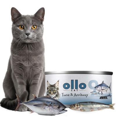 OLLO CAT Nr9 Tuńczyk i Anchois w Sosie Własnym 70g - Tuńczyk i anchois są źródłem wysokiej jakości białka, dostarczają także długołańcuchowych wielonienasyconych kwasów tłuszczowych z serii Omega 3, które są niezbędne dla zapewnienia lśniących włosów i optymalnego zdrowia skóry.