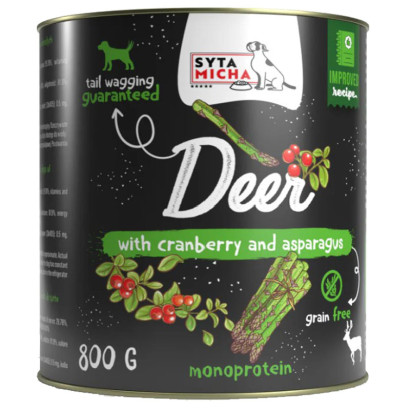 ➡️Syta Micha z jeleniem, żurawiną i szparagami to jedyna w swoim rodzaju mokra karma dla psa. Idealne połączenie lekkostrawnego łososia, bogatej w żelazo dziczyzna, owoców, warzyw oraz oleju z łososia tworzy zdrowy, pełnoporcjowy posiłek dla każdego dorosłego pupila.