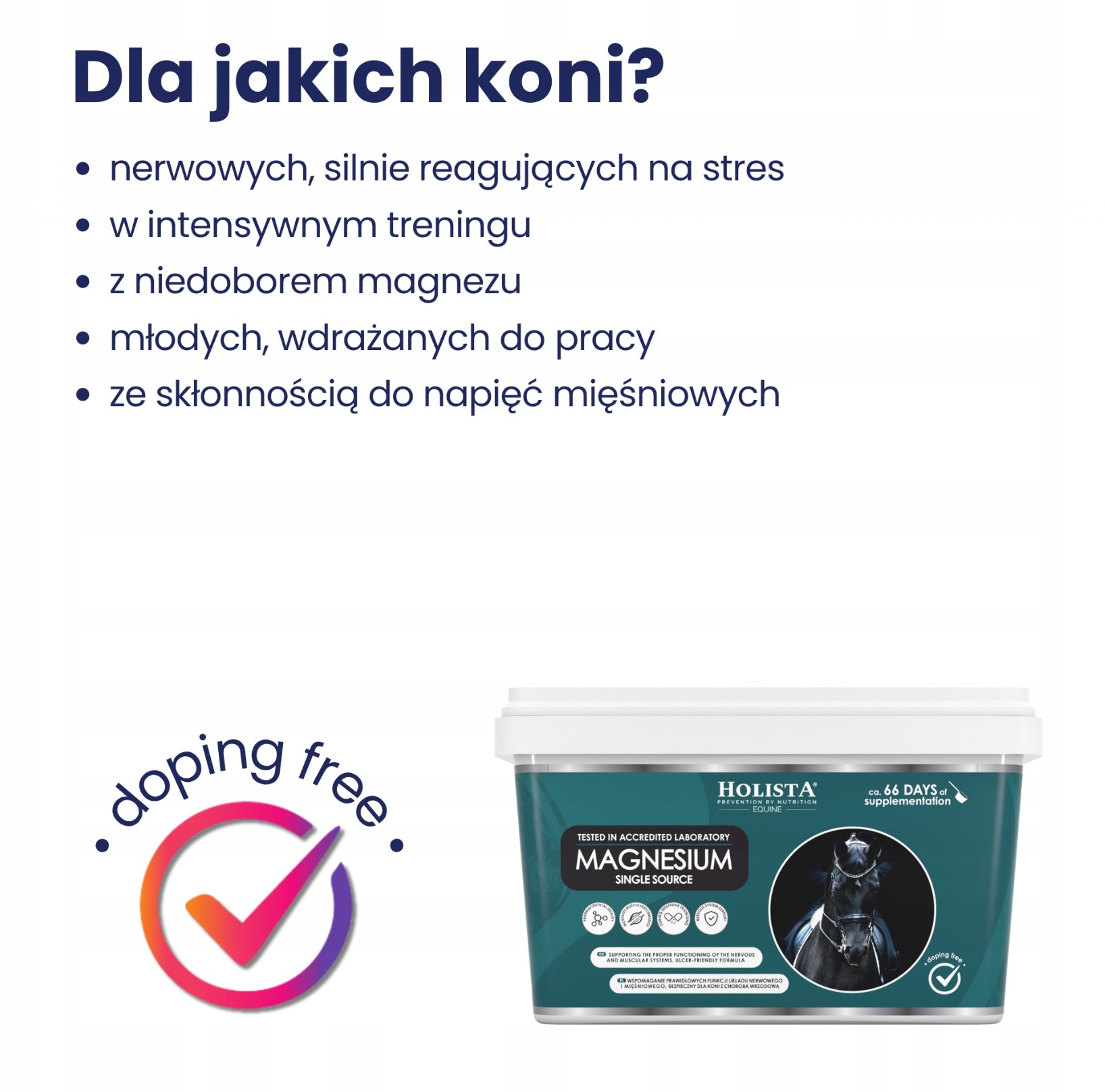 W przypadku większego zapotrzebowania (koni nadpobudliwych, w sytuacjach stresogennych lub w przypadku niedoboru magnezu) dawkę dzienną można podwoić. i podzielić na 2 porcje.