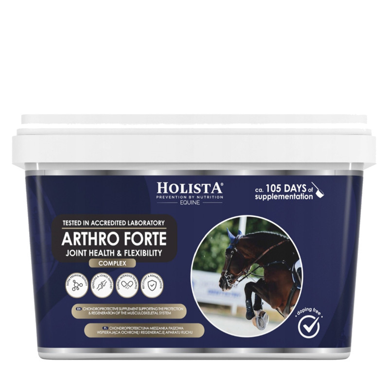 Arthro Forte Joint Health & Flexibility wspomaga odbudowę chrząstki stawowej, poprawia elastyczność i mobilność stawów oraz zwiększa komfort ruchu. Dzięki obecności kwasu hialuronowego i składników chondroprotekcyjnych wspiera naturalne procesy przeciwzapalne i przyspiesza regenerację po wysiłku, pomagając utrzymać sprawność koni sportowych, starszych i w rekonwalescencji.