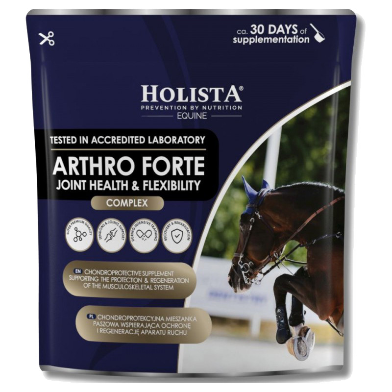 Arthro Forte Joint Health & Flexibility wspomaga odbudowę chrząstki stawowej, poprawia elastyczność i mobilność stawów oraz zwiększa komfort ruchu. Dzięki obecności kwasu hialuronowego i składników chondroprotekcyjnych wspiera naturalne procesy przeciwzapalne i przyspiesza regenerację po wysiłku, pomagając utrzymać sprawność koni sportowych, starszych i w rekonwalescencji.