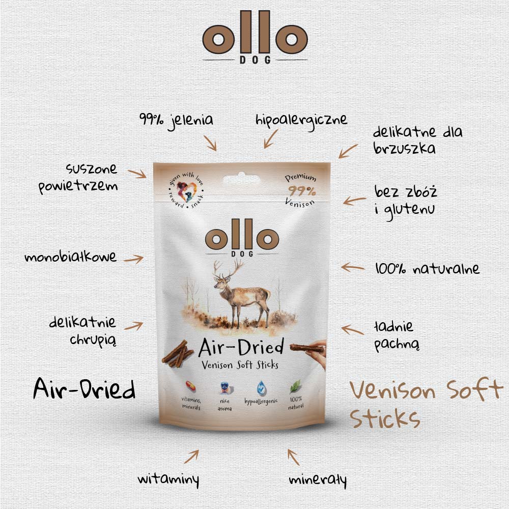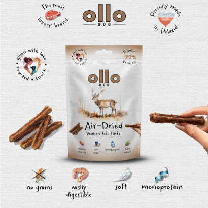 🐶Przysmaki dla psa OLLO Air Dried Venison Soft Sticks 80g to naturalne, hipoalergiczne, monobiałkowe smaczki z jelenia. Są delikatnie suszone powietrzem. W kształcie pałeczek. W 100% naturalny produkt, stworzony z myślą o psach wszystkich ras i w każdym wieku. Są miękkie i monobiałkowe, co jest niezwykle istotne dla psów z alergiami pokarmowymi oraz tych z wrażliwym żołądkiem.
