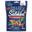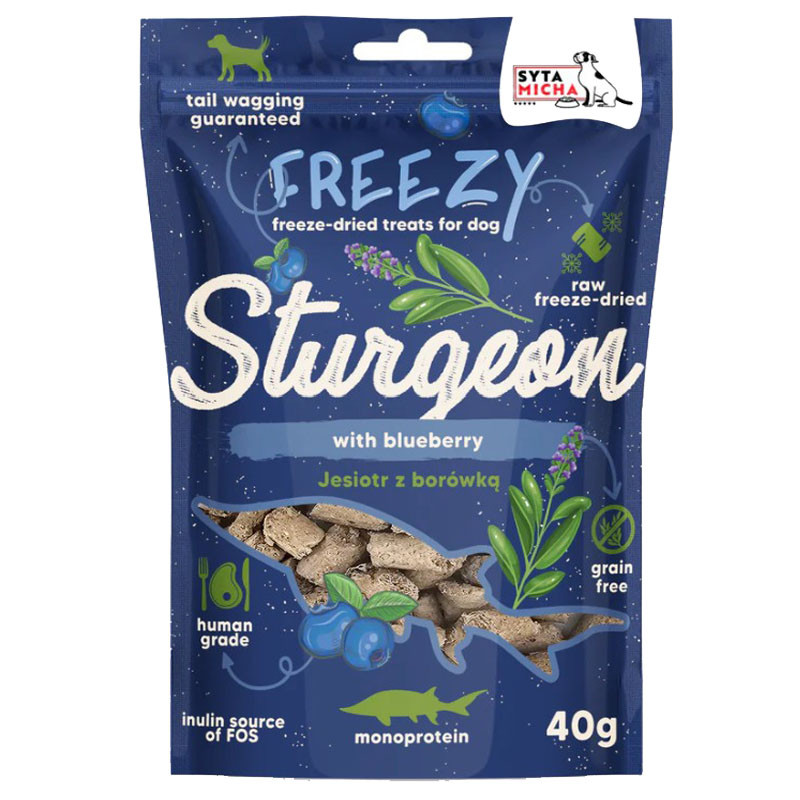 Poznaj Syta Micha FREEZY – wyjątkowe, liofilizowane smaczki, które powstały z najwyższej jakości świeżego mięsa jesiotra, skarbnicy antyoksydanów, czyli borówki i odświeżającej szałwii. To coś więcej niż zwykła przekąska – to doskonała nagroda, która wspiera zdrowie i dobre samopoczucie psa, dostarczając mu naturalnych, wartościowych składników odżywczych.