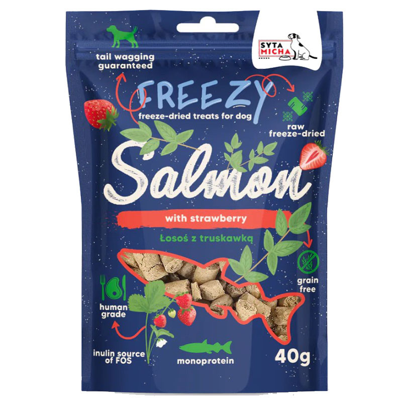 Poznaj Syta Micha FREEZY – wyjątkowe, liofilizowane smaczki, które powstały z najwyższej jakości świeżego mięsa łososia, soczystej truskawki i aromatycznej bazylii. To coś więcej niż zwykła przekąska – to doskonała nagroda, która wspiera zdrowie i dobre samopoczucie psa, dostarczając mu naturalnych, wartościowych składników odżywczych.