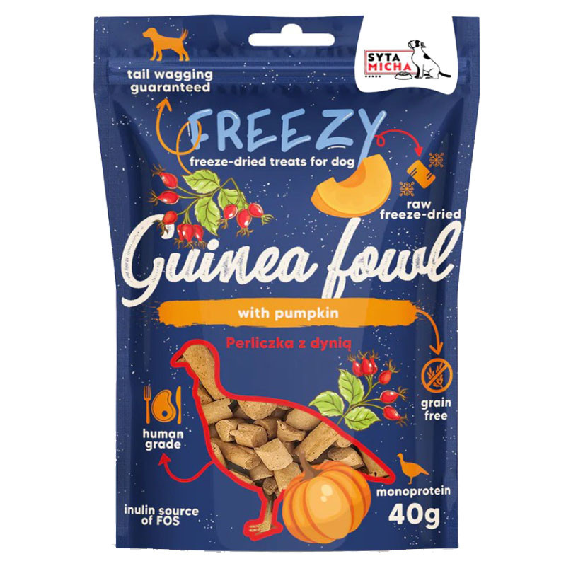 Poznaj Syta Micha FREEZY – wyjątkowe, liofilizowane smaczki, które powstały z najwyższej jakości świeżego mięsa perliczki, prebiotycznej dyni oraz bogatej w witaminę C dzikiej róży. To coś więcej niż zwykła przekąska – to doskonała nagroda, która wspiera zdrowie i dobre samopoczucie psa, dostarczając mu naturalnych, wartościowych składników odżywczych.