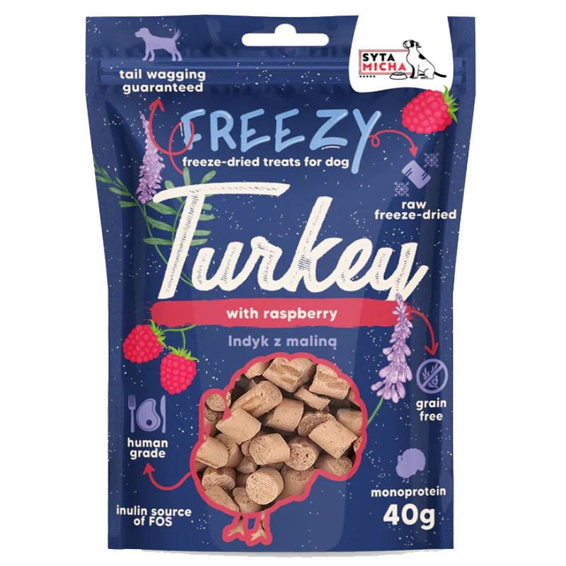 Poznaj Syta Micha FREEZY – wyjątkowe, liofilizowane smaczki, które powstały z najwyższej jakości świeżego mięsa indyka, soczystych malin i aromatycznej lawendy. To coś więcej niż zwykła przekąska – to doskonała nagroda, która wspiera zdrowie i dobre samopoczucie psa, dostarczając mu naturalnych, wartościowych składników odżywczych.
