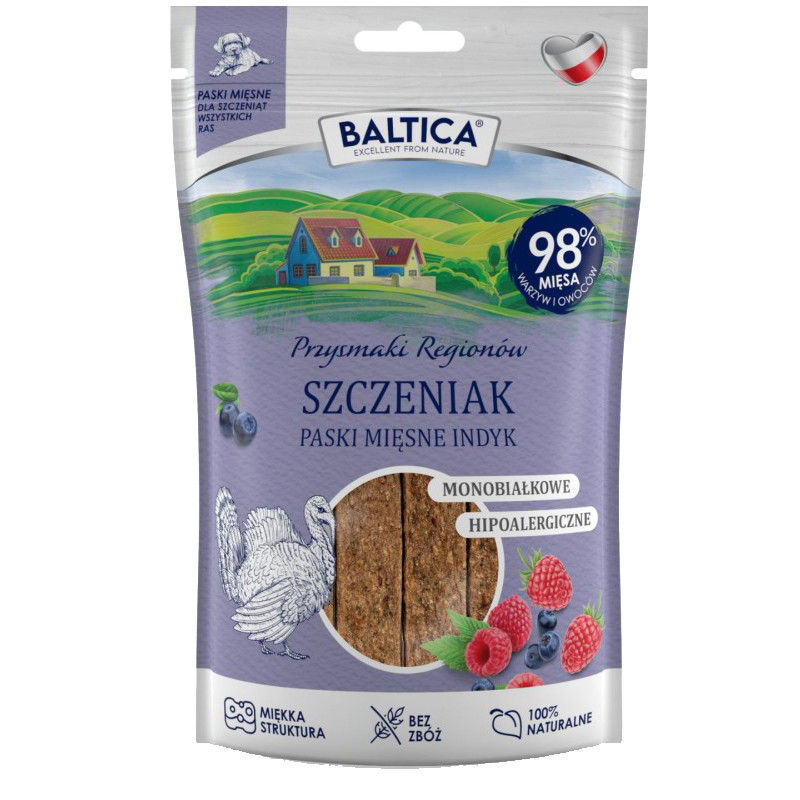 ✔️Baltica Szczeniak Paski Mięsne Indyk to przekąska opracowana z myślą o potrzebach żywieniowych młodych psów w okresie intensywnego wzrostu. Receptura oparta na jednym źródle białka zwierzęcego (indyk) minimalizuje ryzyko reakcji niepożądanych i sprawdza się również w przypadku szczeniąt z wrażliwym układem pokarmowym. Mięso z indyka dostarcza pełnowartościowego, łatwo przyswajalnego białka i aminokwasów niezbędnych do prawidłowego rozwoju mięśni oraz tkanek. Dodatek malin i borówek wzbogaca skład o naturalne antyoksydanty wspierające odporność i ogólną witalność młodego organizmu.