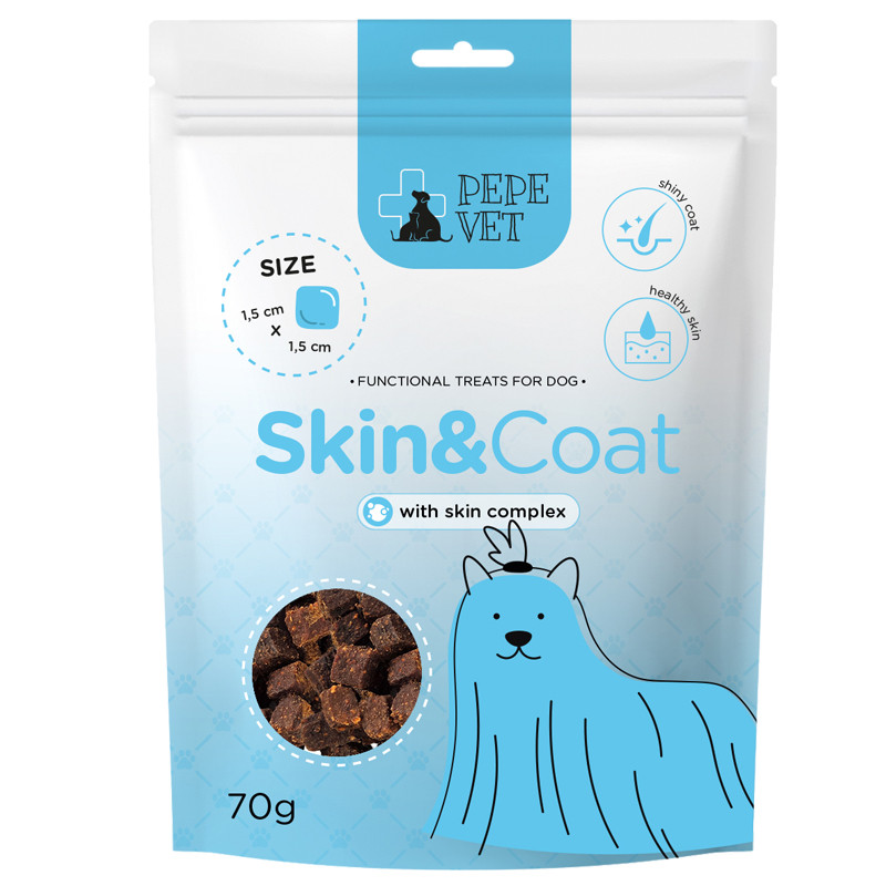 - Przysmaki PEPE VET Skin & Coat wykorzystują naturalny kompleks F2, który wspiera kondycję skóry, strukturę włosa i odporność: