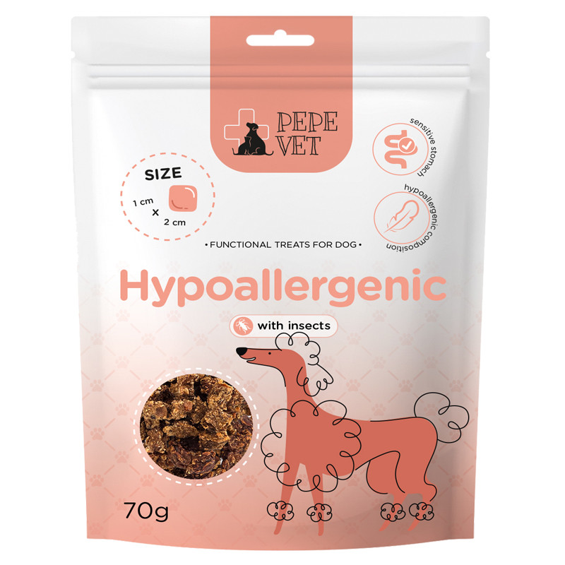 🟣PEPE VET Hypoallergenic Insect to funkcjonalne przysmaki stworzone z myślą o psach z nadwrażliwością pokarmową, alergiami lub delikatnym układem trawiennym. Oparte na innowacyjnym białku z larw Hermetia illucens, są lekkostrawne, pełne wartości odżywczych i wyjątkowo przyjazne dla żołądka. Ich naturalna, bezzbożowa receptura minimalizuje ryzyko reakcji alergicznych, zapewniając zdrowe i bezpieczne nagradzanie każdego dnia.
